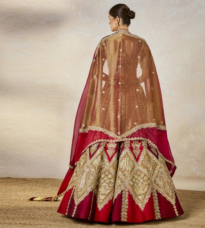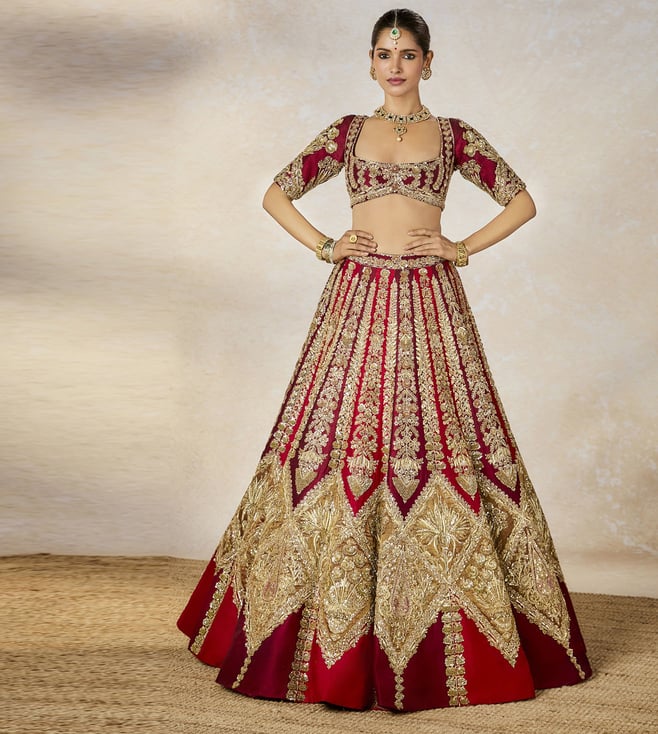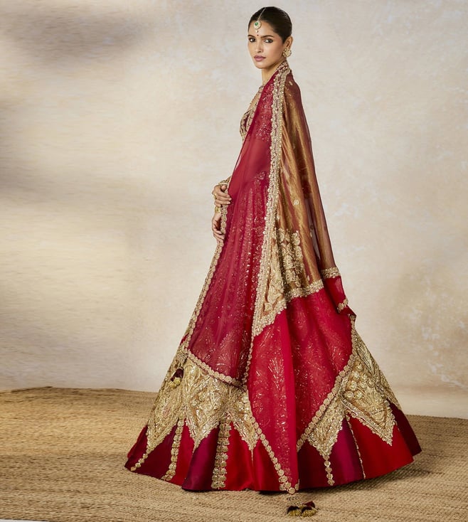 For the bride who wants to stand out in the traditional hue of a marraige, The Kokum Sherbet lehenga is a grand affair. With tissue inlays skirting across the lehenga and our Son Parni, Kusum Kali and Saad Barg nestled within those delicate inlays. Adorned with intricately embroidered dupatta in the shade of red and wine, in a geometrical layout. Comes with a separate cancan.