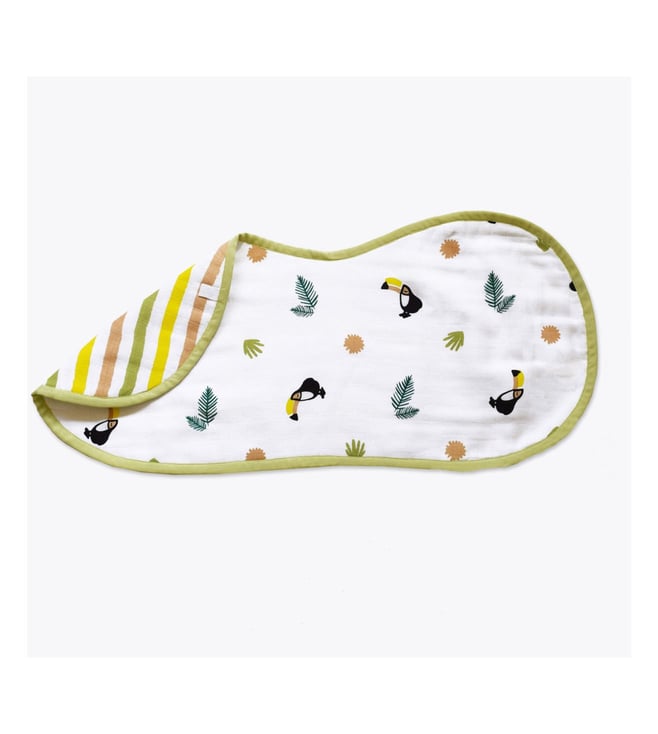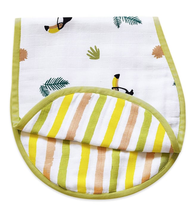 Made with two layers, this all-in-one burp cloth and bib keeps you and your little one clean. The absorbent fabric with its unique shape sits right over your kid's shoulder. It also doubles as a larger coverage bib that drapes over your baby's shoulders and snaps at the back for a breathable bib that catches the sneakiest of side dribbles. It is lightweight and fast drying. Made by hand, slight variations are natural. It comes in a pack of 2. It is made of organic cotton muslin. Disclaimer: Product colour may slightly vary due to photographic lighting sources. Country of Origin - India.