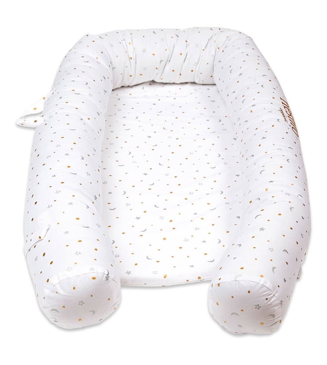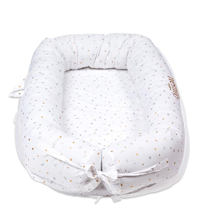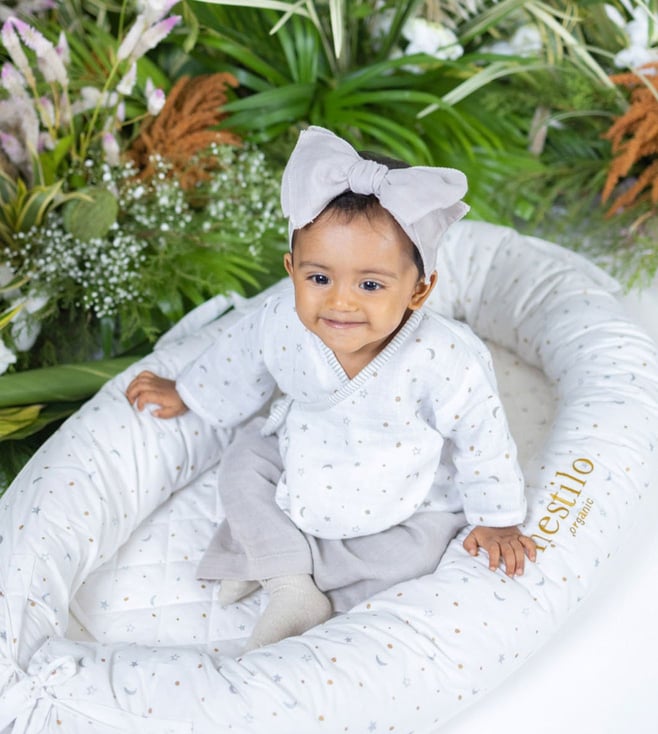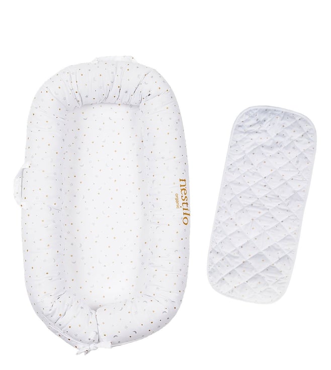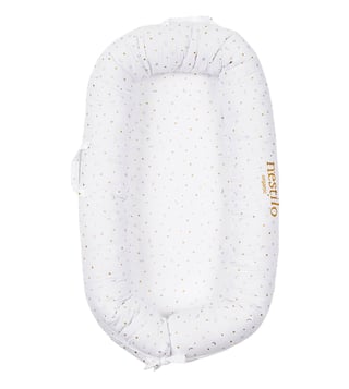 Made using 100 percent organic cotton, this nestilo is a portable bed for your baby to rest anytime, anywhere. Pop it into the complementary canvas carry bag and off you go. If you intend to co-sleep, the nestilo provides a safe barrier between parents and their babies. It can be adjusted with the ties at the bottom. A nestilo liner comes included for absorbing the occasional baby juice and has a removable cover. Made by hand, slight variations are natural and part of the charm. Disclaimer: Product colour may slightly vary due to photographic lighting sources. Country of Origin - India.
