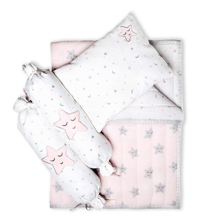 Welcome the little one home in grand style with this mini cot set. This set features irresistibly soft sleep essentials just what every baby needs to drift off into dreamland. This set includes 1 pillow with insert included, 2 bolsters with insert included and 1 dohar blanket. The light and airy dohar blanket is your little one's warm weather BFF. Printed by hand, slight variations are natural. It is made of organic cotton. Disclaimer: Product colour may slightly vary due to photographic lighting sources. Country of Origin - India.