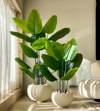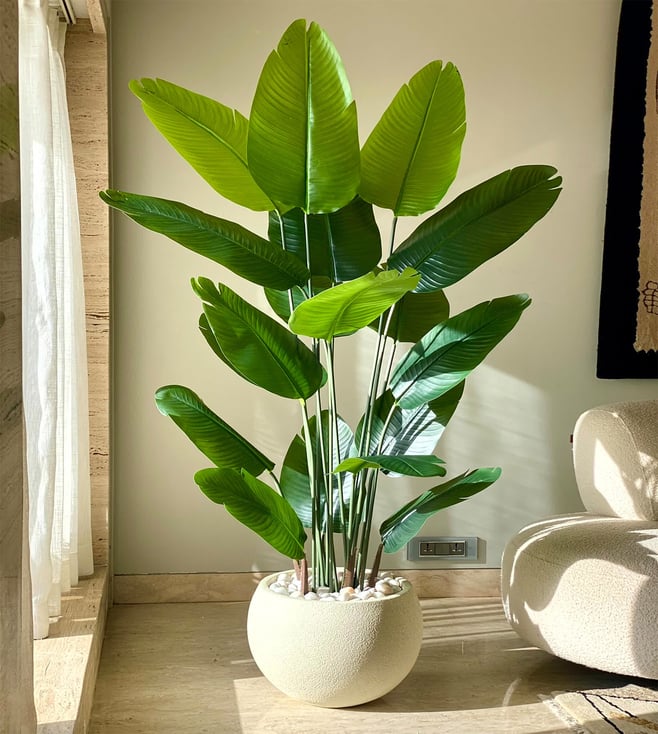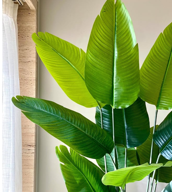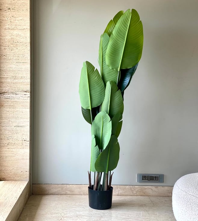 Add a tropical vibe to your space with this lifelike artificial traveller's palm. With its wide, fan-like leaves and sturdy stems, this PVC artificial palm brings the exotic beauty of the tropics indoors without the need for care. Perfect for homes, offices or event decor, it creates a lush, vibrant look all year round. This maintenance-free palm is ideal for adding height and greenery to any room, bringing effortless style to your interior design. Disclaimer: Product colour may slightly vary due to photographic lighting sources. Country of Origin - India.