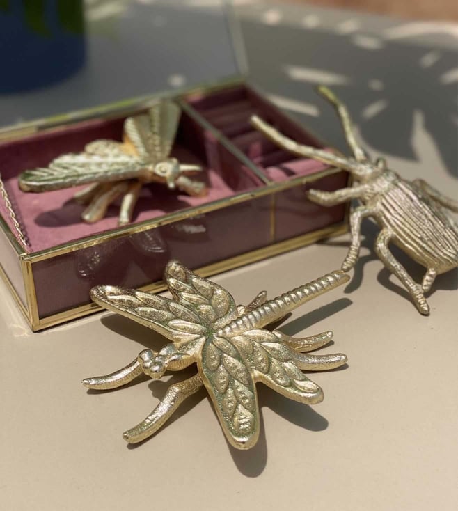 Bring nature home in fashionable form with this set of 3 bee fly accents in a gold finish from Mason Home. Realistically designed, the little friends feature beautiful detailing in three different shaped forms. The bee, dragonfly and beetle will liven up your decor. Use the set as a paperweight or place it on a tabletop. It is made using aluminium. Disclaimer: All other items in the image are only for display purposes and will not be a part of the delivery content. Product colour may slightly vary due to photographic lighting sources. Country Of Origin - India.