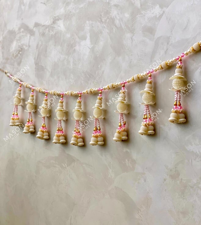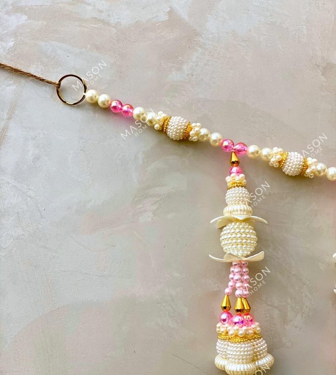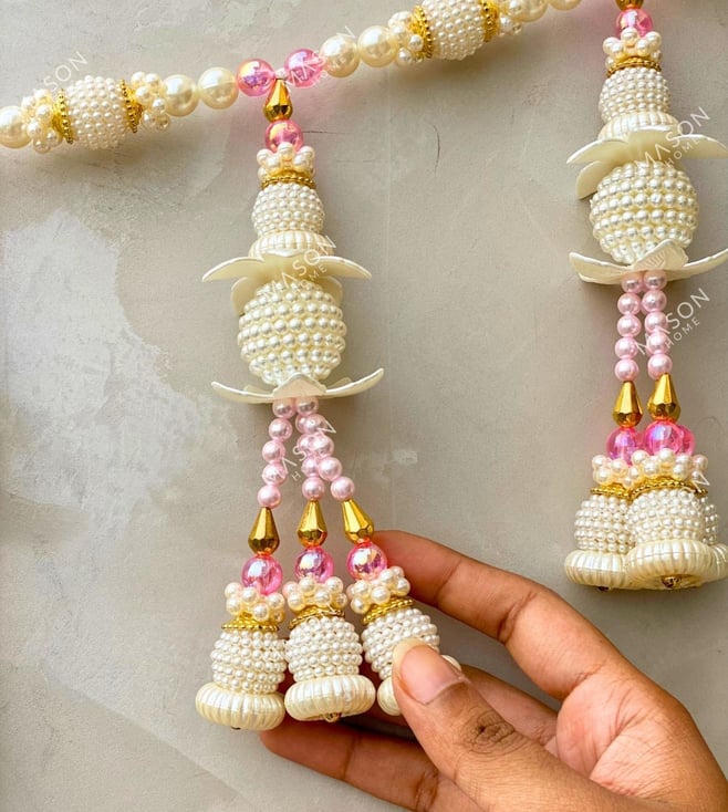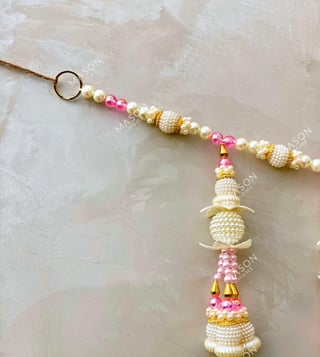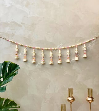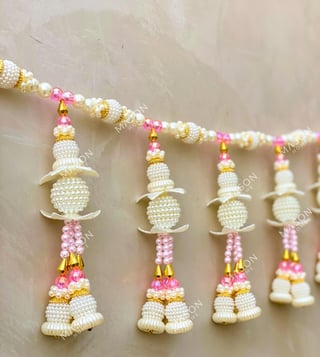 Add a touch of refined charm to your festive decor with the  Festive Pearl Bloom Toran. Featuring delicate pearl accents and soft floral details, this toran brings an elegant, serene vibe to any space. Perfect for adorning entrances, pooja setups, or walls, it blends traditional design with modern grace making it a beautiful addition for Diwali, Ganpati, or wedding celebrations.