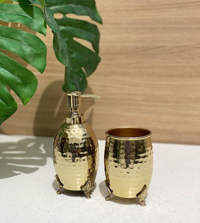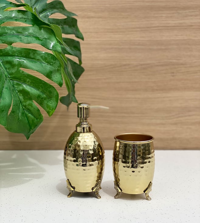 Enhance the decor of any bathroom with this Safi bathroom set in gold from Mason Home. With a simple yet attractive hammered texture in a brass finish, this set is a perfect addition to your collection. Disclaimer: All other items in the image are only for display purposes and will not be a part of the delivery content. Product color may slightly vary due to photographic lighting sources.
