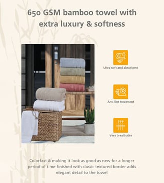 Pamper yourself with this towel. Made of a premium quality pile of 65 percent bamboo and 35 percent cotton with 650 GSM, this towel is soft and easily washable. Disclaimer: Product colour may slightly vary due to photographic lighting sources. Country of Origin - India.