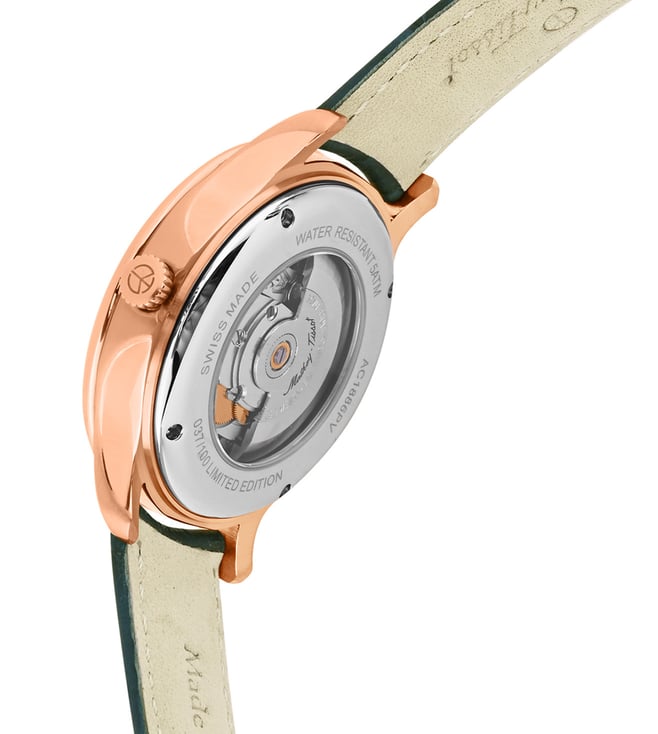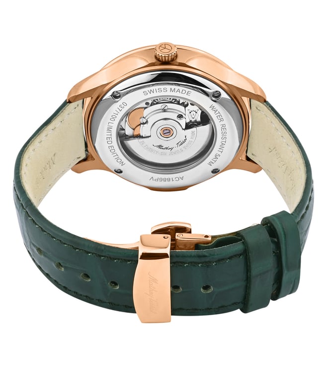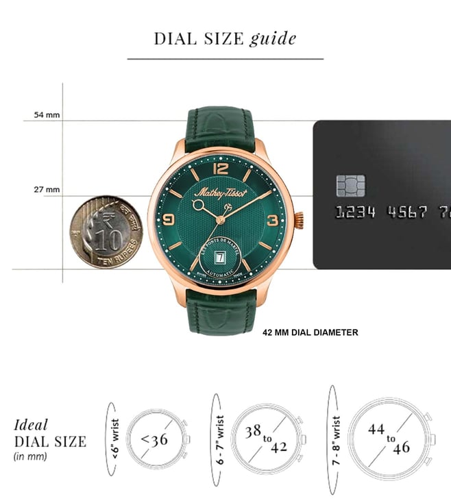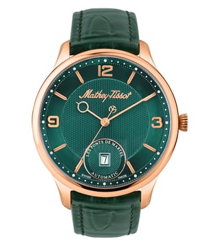 Amaze everyone around you by wearing this men's analog watch from the collection by MATHEY TISSOT. The blue round dial is protected by a sapphire glass. It features and a crown for time adjustment. The leather strap comes in a grenn hue that further elevates the look of the timekeeper. Besides, it is completed with a buckle clasp to ensure a secure fit on the wrist.