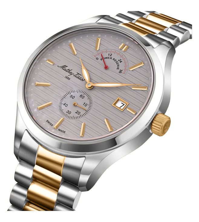 The Mathey Tissot Urban Power Reserve Auto Quartz Mens Watch H411ATPRRS combines Swiss precision with modern elegance. Designed in a 42 mm case, it features a refined dial with a power reserve indicator, blending style with functionality. Powered by auto quartz movement, it delivers accurate timekeeping and dependable performance. A versatile timepiece, it is perfect for both formal occasions and everyday wear, making it a must-have for the contemporary gentleman.