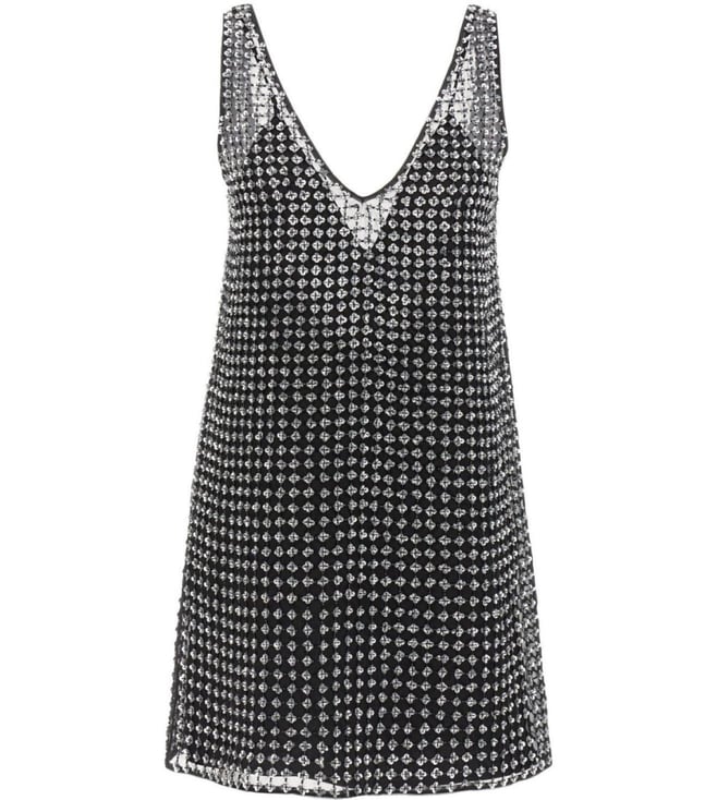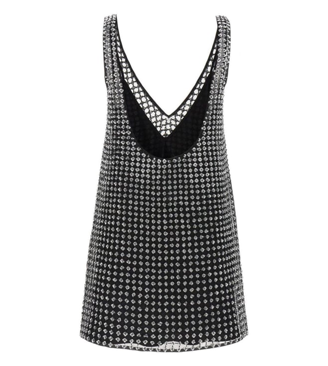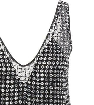 Unveil elegance with this stunning black dress, a masterpiece of sophistication and allure. Crafted from 100% silk, it drapes effortlessly, caressing the skin with its luxurious touch. The sleeveless design and daring V-neckline exude confidence, while the intricate embellished pattern adds a touch of opulence, catching the light with every movement. Designed for the modern woman, this dress features a seamless closure, ensuring a flawless silhouette. Perfect for any occasion where elegance is paramount.