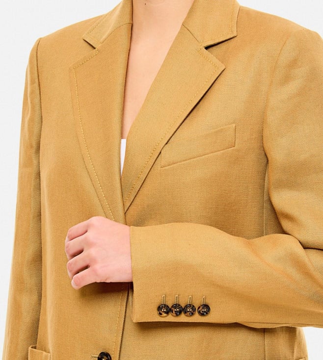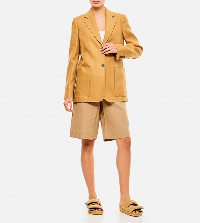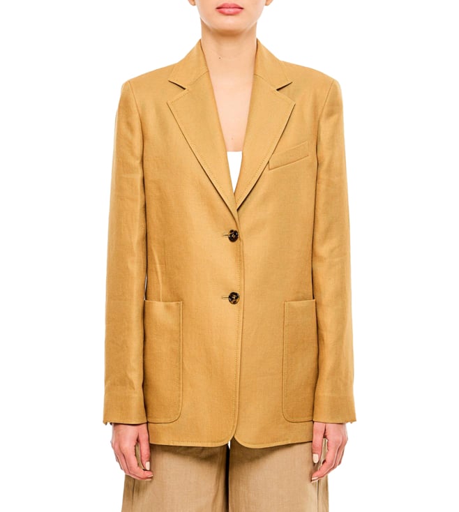 Elevate your wardrobe with this sophisticated brown blazer, crafted from 100% cotton for a luxurious feel. Its solid pattern exudes timeless elegance, while the long sleeves and lapel collar add a touch of classic refinement. Designed for the modern woman, this blazer features a sleek closure that ensures a tailored fit, making it perfect for both professional settings and chic casual outings. Versatile and stylish, it's a must-have piece that seamlessly blends comfort with contemporary fashion.