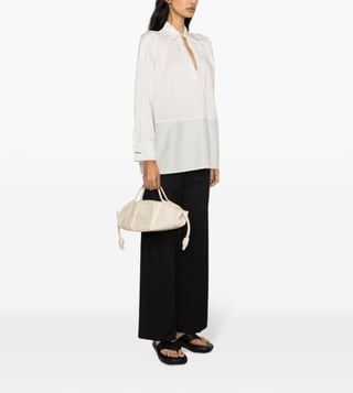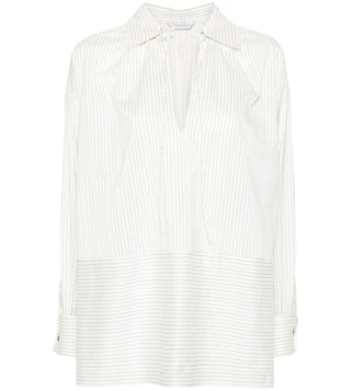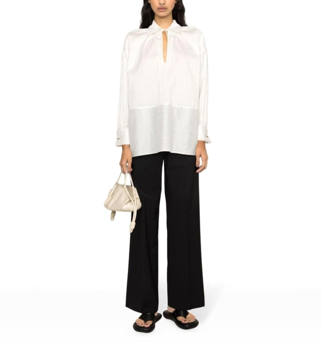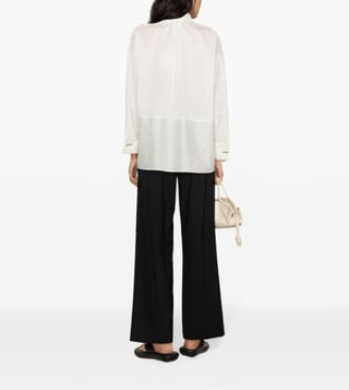 Elevate your wardrobe with this elegant casual shirt, featuring a timeless white hue adorned with subtle stripes. Designed for the modern woman, it boasts long sleeves and a classic shirt collar, exuding sophistication. Crafted from a luxurious blend of 80% cotton and 20% silk, it offers a soft, breathable feel with a hint of sheen. The button-down closure ensures a tailored fit, making it perfect for both professional settings and leisurely outings. Embrace effortless style with this versatile piece.