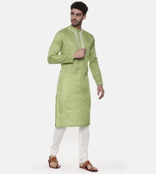 Score high on the fashion meter by wearing this kurta from Mayank Modi. Tailored to sartorial perfection from linen and silk, it assures a soft and soothing touch against the skin. It is featured with subtle hand-embroidery detailing on the placket. It is perfect a mehendi function. Disclaimer: All other items in the image are only for display purposes and will not be a part of the delivery content. Product colour may slightly vary due to photographic lighting sources. Country Of Origin - India.