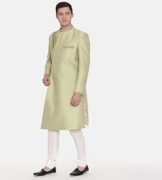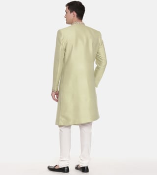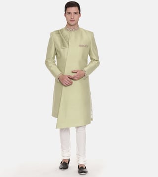 Craft an impeccable look by wearing this sherwani. This sherwani has been graced up with pleated detail and subtle embroidery. It has been crafted with care using silk and cotton for a smooth touch on the skin. Disclaimer: All other items in the image are only for display purposes and will not be a part of the delivery content. Product colour may slightly vary due to photographic lighting sources. Country Of Origin - India.