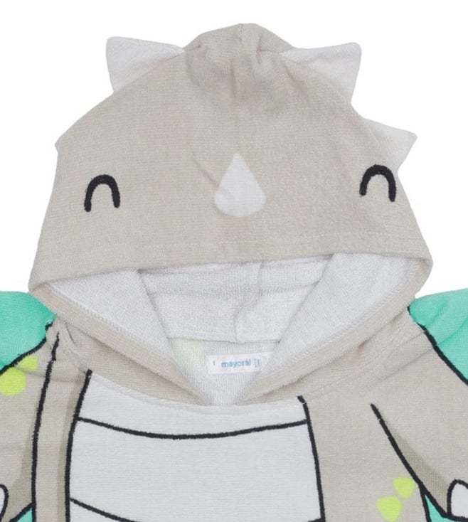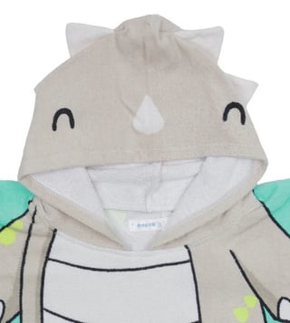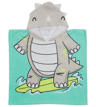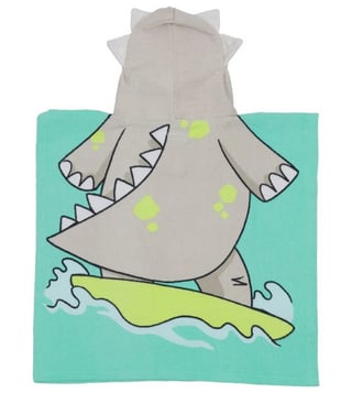 This baby beach towel features a cute grey dinosaur surfing on a lime green board against a teal wave background. The hooded design adds warmth and fun for beach or pool time. Soft and absorbent for little ones.