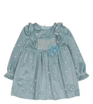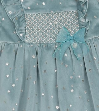 A beautifully detailed dress brings a touch of charm to every wardrobe. Designed with a glittery star pattern, it features an elegant smocked panel on the bodice and elasticated cuffs with refined detailing. A decorative bow adds a delightful finishing touch, making it ideal for kids to feel stylish and comfortable.