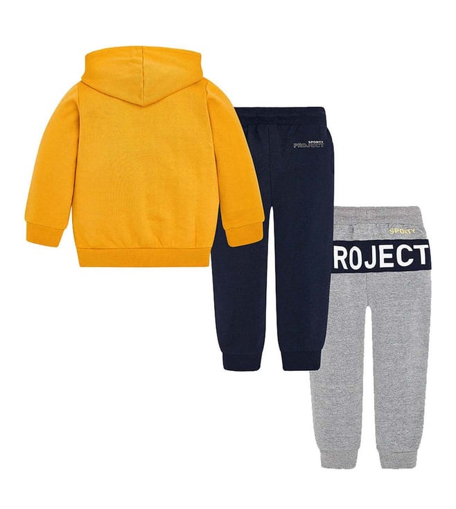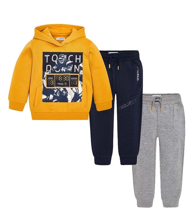 Spruce up your little one's look with this set of hooded sweatshirt and 2 trackpants from Mayoral. Tailored to sartorial perfection, it assures a soft and comfortable feel to your kid all day long. Exuding full sleeves, it is sure to fetch you compliments from all. The printed pattern makes it a captivating choice.