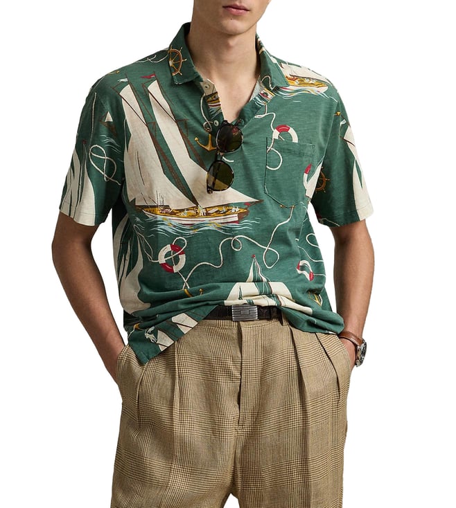 Green Classic Fit Sailboat Jersey Polo Shirt
