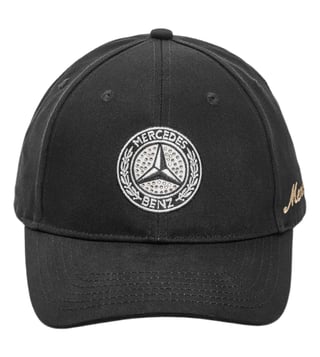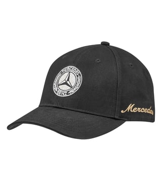 This cap has an eye-catching design. In black colour shade and made from 100 percent cotton, the size-adjustable cap is not only exceptionally comfortable in terms of design it also has a very attractive look. In addition to the gold-coloured vintage "Mercedes" lettering embroidered on the back, the embroidered classic star on the front, trimmed with crystals, is a particular highlight.