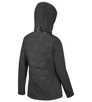 A zippered, detachable, wadding, tapered hood bonded with a romaine pattern, an inside pocket with zip fastener, side pockets and a chin guard round off the jacket's features. The slim-fit hybrid jacket is also comfortable to wear: The inner cord with stopper allows the hem width to be adjusted, for example, while the sleeve clearance can be individually adapted thanks to the practical velcro fastening. The women's gilet is aesthetically pleasing too, and the stitched-on black plastic badge on the chest with white 3D AMG logo is a real highlight.