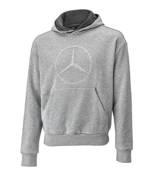 Sporty cut and cosy-soft fabric: the sweatshirt hoodie in grey-melange is the ideal choice for cooler days and promises comfortable wear in everyday life with its slightly overcut shoulders and its modern fit. The hood and kangaroo pocket of the hoodie are lined with single jersey, and the hem and cuffs are designed in 1x1 rib. A refined embossed 3D Mercedes star on the front cleverly completes the design.