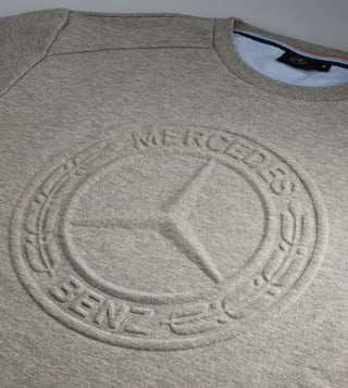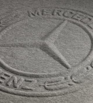 The sweatshirt in the colour shade grey marl is characterised by its easy-care materials and optimal wear comfort. Also, the jumper looks really good. The yoke in the shoulder area as well as the front and back section, single-ribbed hem on the cuffs, crew neck and hem as well as the three-coloured neck band ensure an accomplished design. A light blue crescent on the inside and a large, embossed Mercedes star in a 3D look on the front section round off the style of the modern fit sweatshirt.
