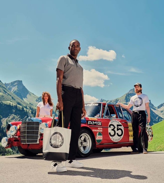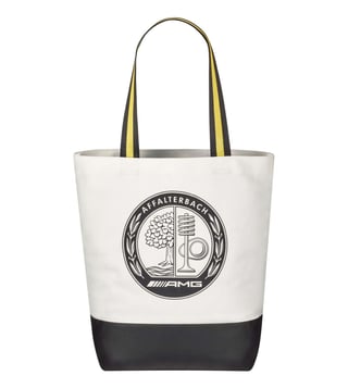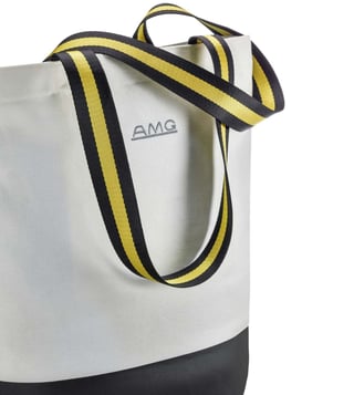 For grocery shopping or small errands in the city: The AMG shopping bag made of 100 percent cotton is versatile. The bag is not only designed with a shoulder strap with yellow contrasting stripes, but the inside pocket can also be securely closed with a zip. To ensure that the bag does not get dirty when stowed away, it features a rubber-plated bottom area printed in black, while a silver gray embroidered AMG Classic logo at the rear and an Affalterbach emblem at the front round off the design stylishly.