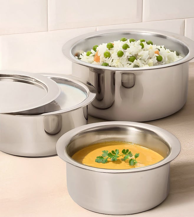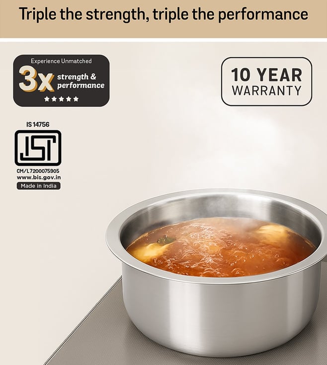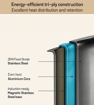 Triple-layer (Tri-ply) Construction : Combines food-grade 304 stainless steel with a thick aluminum core for even heating and exceptional durability.Versatile Compatibility: Perfect for induction, gas, electric, and ceramic cooktops.Safe & Healthy: Made with 100% food-grade stainless steel that is non-toxic and non-reactive.Comfortable Handle: Designed for an easy, secure grip, making cooking effortless.Even Heat Distribution: Thick aluminum base prevents hotspots, ensuring consistent cooking results.Durable Lid: Comes with a thick lid to lock in moisture and flavors for better cooking.
