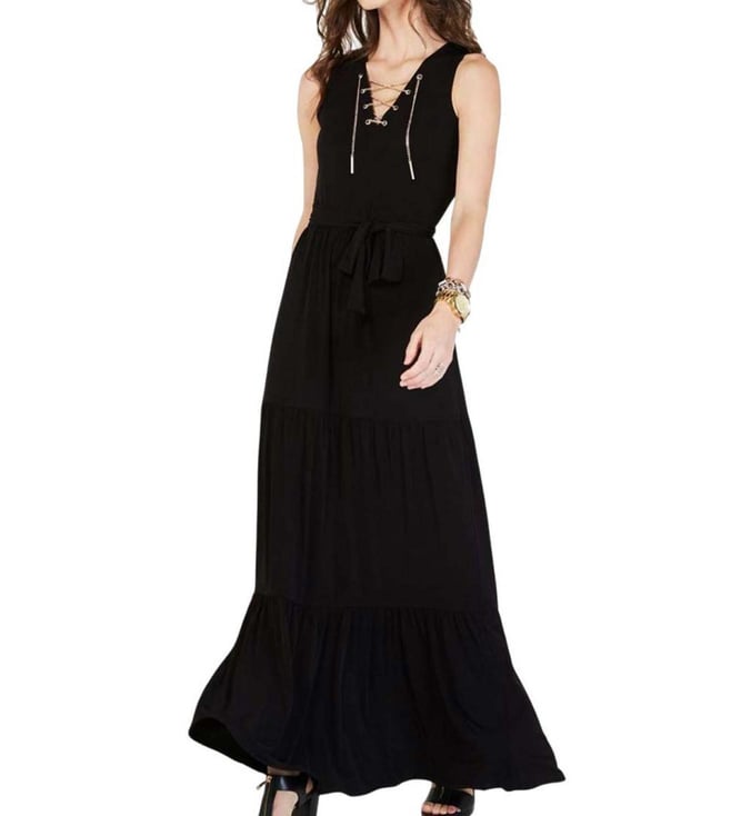 Adorn the modern look with this black lace-up belted maxi dress from Michael Kors crafted in polyester/elastane featuring v-neck, sleeveless, belted, chain detailing, maxi length.