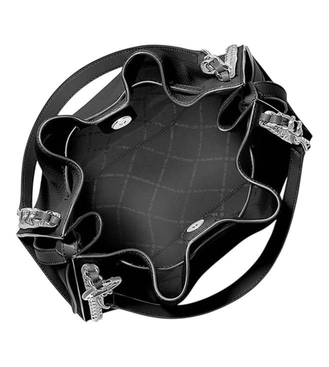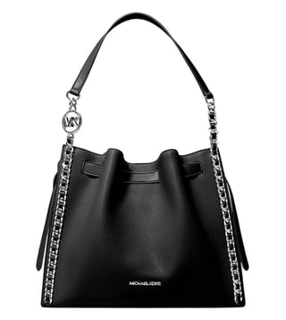 Michael Kors Black Mina Large Shoulder Bag crafted in polyurethane, cotton and polyester featuring snap closure, 1 compartment, inside back and front slip pockets, metal logo, dual carry handles. Products purchased from Darveys are supported exclusively by the warranty/exchange policies of Darveys and its partner boutiques. Brand owners and their channel partners are not responsible for exchange/warranty services for items purchased through Darveys.