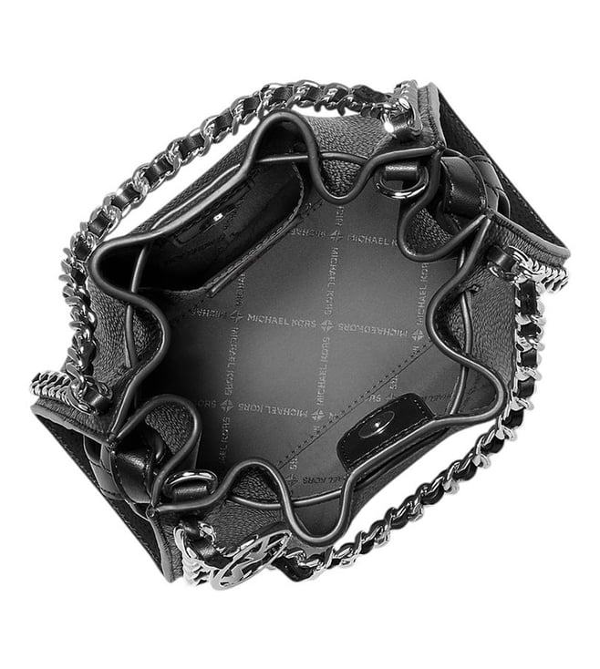 Michael Kors black mina small bucket bag crafted in polyurethane and cotton featuring snap closure, 1 compartment, inside 3 back card slots, front logo, chain top handle with removable adjustable crossbody strap.
