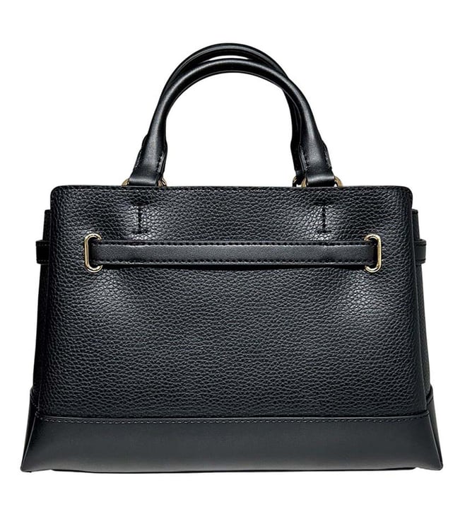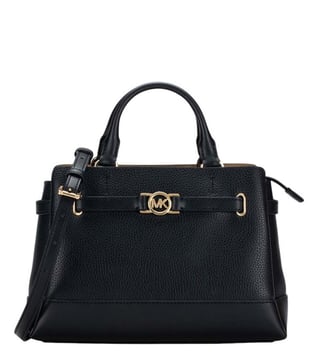 Michael Kors black reed small satchel crafted in leather featuring zip closure, 1 compartment, inside slip pocket, back zip pocket, metal logo, dual carry handles with removable adjustable satchel strap.