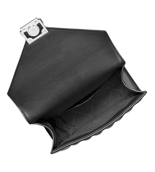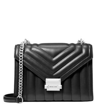 Michael Kors black whitney medium shoulder bag crafted in polyurethane and polyester featuring snap closure, 1 compartment, inside slip pocket, metal logo, convertible chain-link shoulder strap. Products purchased from Darveys are supported exclusively by the warranty/exchange policies of Darveys and its partner boutiques. Brand owners and their channel partners are not responsible for exchange/warranty services for items purchased through Darveys.