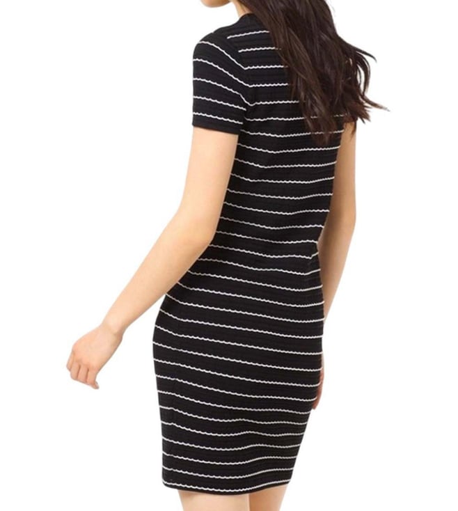 Amp up your wardrobe with this blackwhite striped scalloped bodycon sweater dress from Michael Kors crafted in viscose/ nylon/elastane featuring crewneck, short sleeves, striped and pullover.