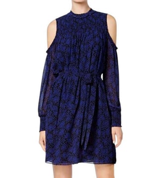 Adorn the modern look with this blue cold-shoulder printed dress from Michael Kors crafted in polyester featuring crewneck, cold shoulder, all-over stars print, long sleeves, above knee length.
