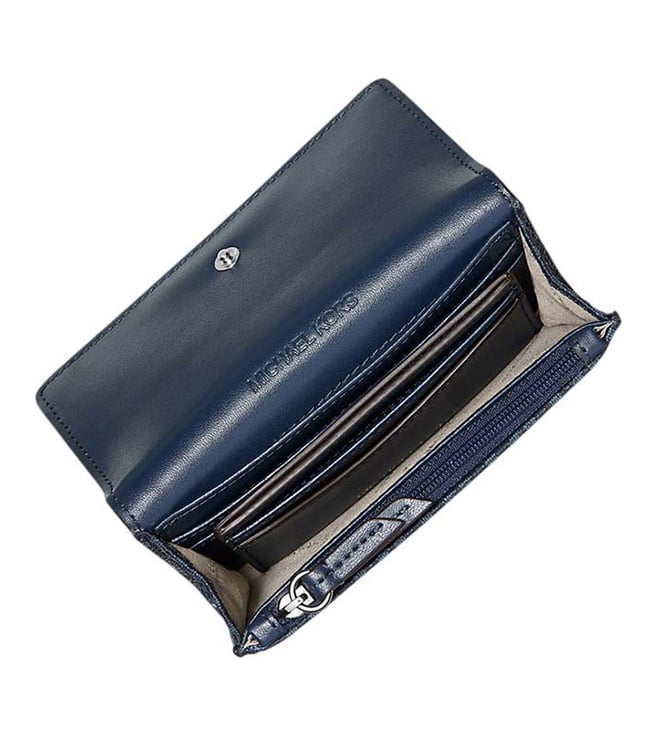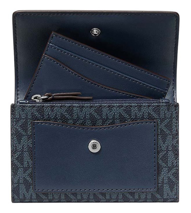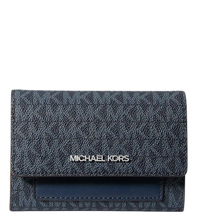 Accessorize perfectly with this blue jet set signature wallet and card holder set by Michael Kors crafted in coated canvas, polyester, polyurethane featuring snap closure, 3 card slots, zip pocket and logo detailing to give you a luxe appeal.