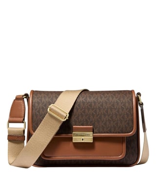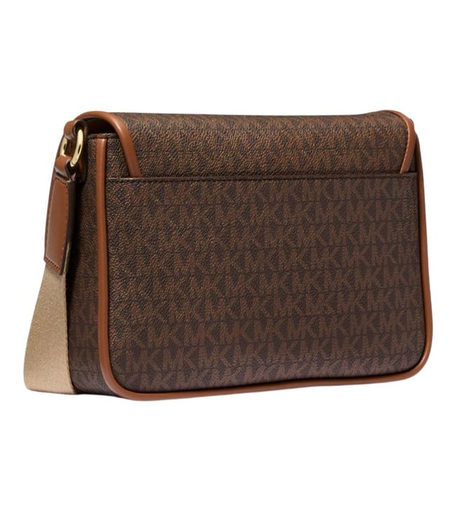 Michael Kors brown bradshaw medium messenger bag crafted in coated canvas and polyester featuring snap closure, 1 compartment, inside zip pocket, outside front pocket, front logo, adjustable crossbody strap. Products purchased from darveys are supported exclusively by the warranty/exchange policies of darveys and its partner boutiques. Brand owners and their channel partners are not responsible for exchange/warranty services for items purchased through darveys.