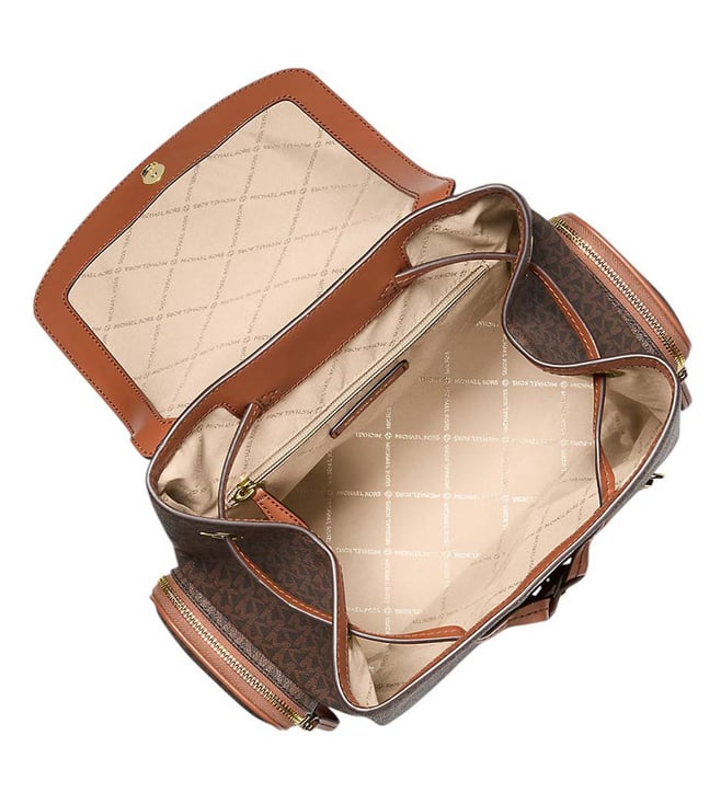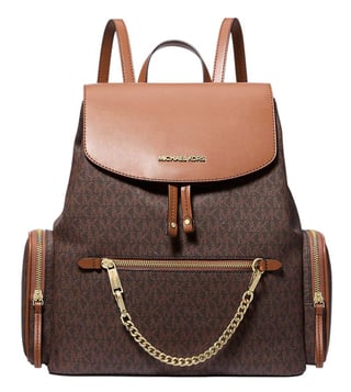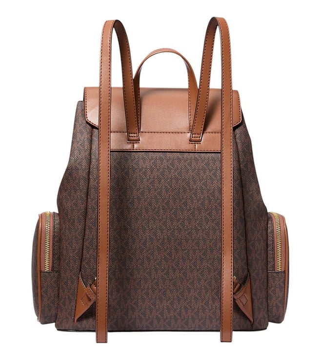 Michael Kors Brown Jet Set Large Backpack crafted in coated canvas and polyester featuring snap and drawstring closure, 1 compartment, inside zip pocket, outside front zip pocket, 2 side zip pockets, metal logo, top handle with adjustable backpack straps.