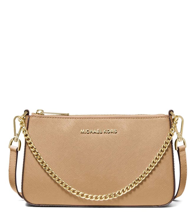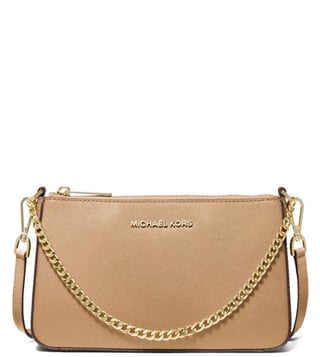 Michael Kors Light Brown Jet Set Medium Crossbody Bag crafted in leather featuring zip closure, 1 compartment, interior slip pocket & card slots, front logo, removable crossbody strap. Products purchased from Darveys are supported exclusively by the warranty/exchange policies of Darveys and its partner boutiques. Brand owners and their channel partners are not responsible for exchange/warranty services for items purchased through Darveys.