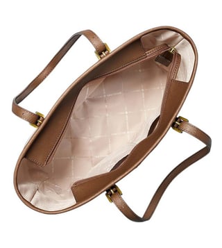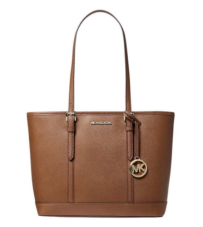 Michael Kors brown jet set travel small tote crafted in leather featuring zip closure, 1 compartment, inside back zipper pocket, 2 front slit pockets, metal logo, dual carry handles. Products purchased from Darveys are supported exclusively by the warranty/exchange policies of Darveys and its partner boutiques. Brand owners and their channel partners are not responsible for exchange/warranty services for items purchased through Darveys.