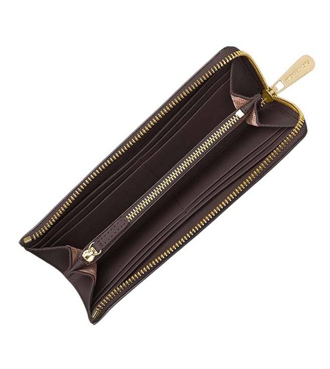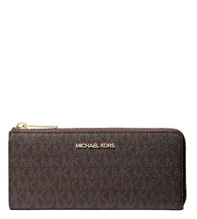Accessorize perfectly with this brown jet set zip wallet by Michael Kors crafted in coated canvas, polyester and polyurethane featuring zip closure, 2 slip pockets, zip pocket, 8 card slots and logo detailing to give you luxe appeal.