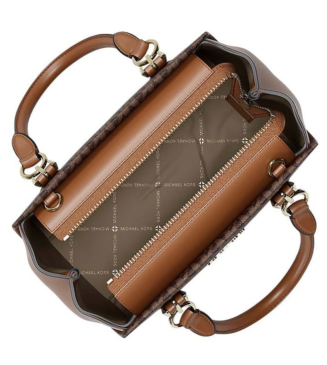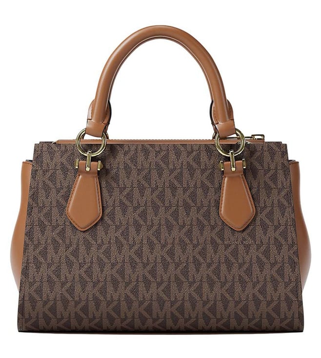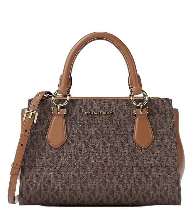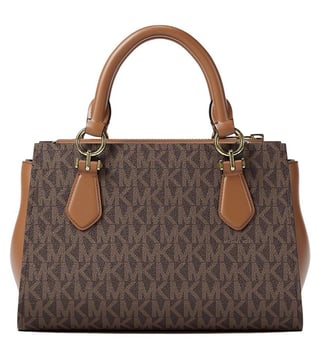 Michael Kors Brown Marilyn Small Satchel crafted in coated canvas and polyester featuring zip closure, 1 compartment, inside pocket, metal logo, dual carry handles with removable adjustable crossbody strap. Products purchased from Darveys are supported exclusively by the warranty/exchange policies of Darveys and its partner boutiques. Brand owners and their channel partners are not responsible for exchange/warranty services for items purchased through Darveys.