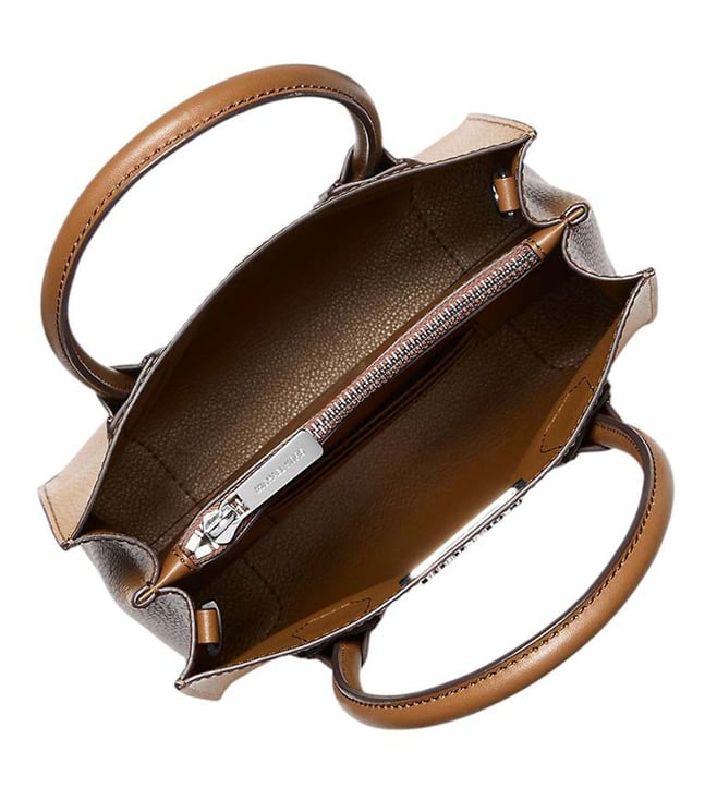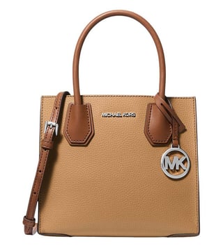 Michael Kors brown mercer medium satchel crafted in leather featuring open top, 2 compartments, center zip compartment, logo detailing, dual carry handles with adjustable removable shoulder strap.