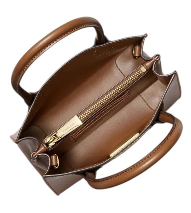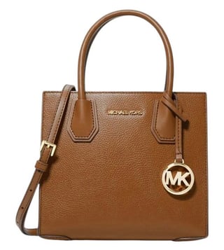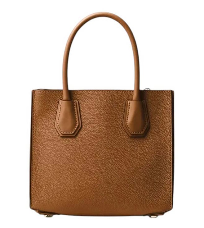 Michael Kors brown mercer medium satchel crafted in leather featuring open top, 2 compartments, center zip compartment, logo detailing, dual carry handles with adjustable removable shoulder strap.
