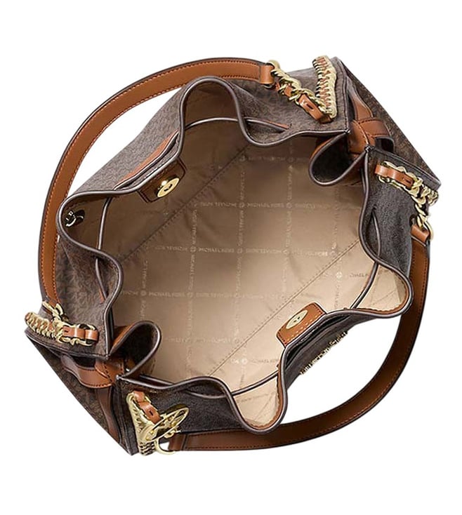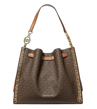 Michael Kors Brown Mina Large Shoulder Bag crafted in coated canvas and polyester featuring snap closure, 1 compartment, inside back and front slip pockets, metal logo, dual carry handles. Products purchased from Darveys are supported exclusively by the warranty/exchange policies of Darveys and its partner boutiques. Brand owners and their channel partners are not responsible for exchange/warranty services for items purchased through Darveys.