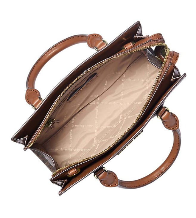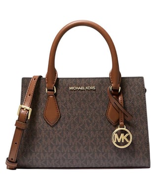 Michael Kors brown sheila small satchel crafted in coated canvas and polyester featuring zip closure, 1 compartment, inside zip pocket, metal logo, charm detailing, dual carry handles with removable adjustable crossbody strap.