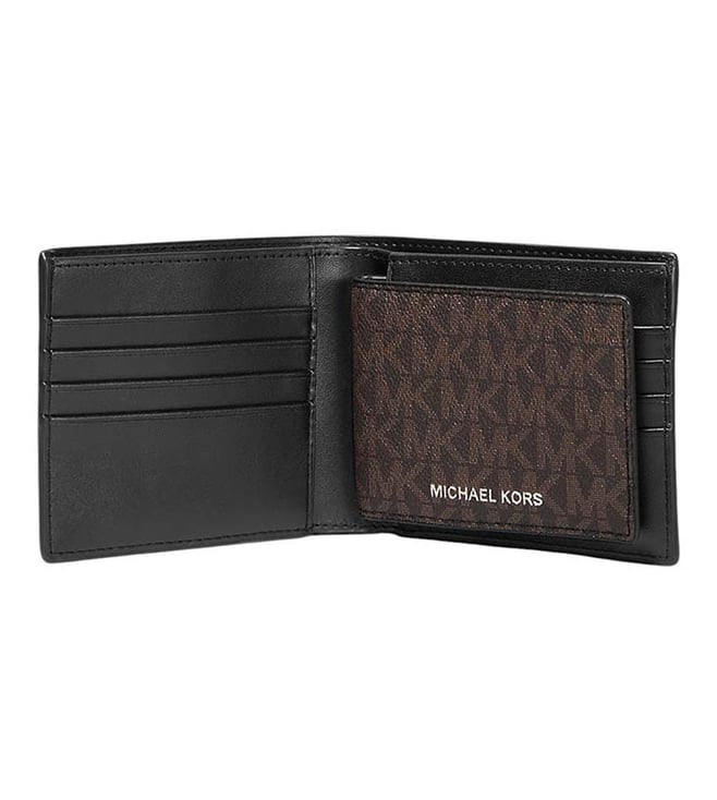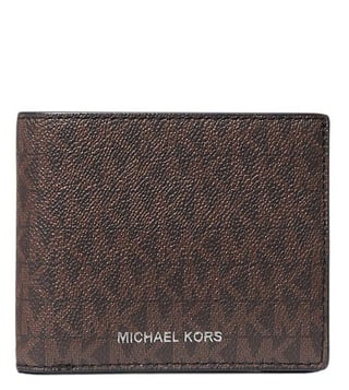 Accessorize perfectly with this brown signature wallet by Michael Kors crafted in coated canvas, polyurethane and polyester featuring bill compartment, card slots, removable id window and logo detailing to give you luxe appeal.
