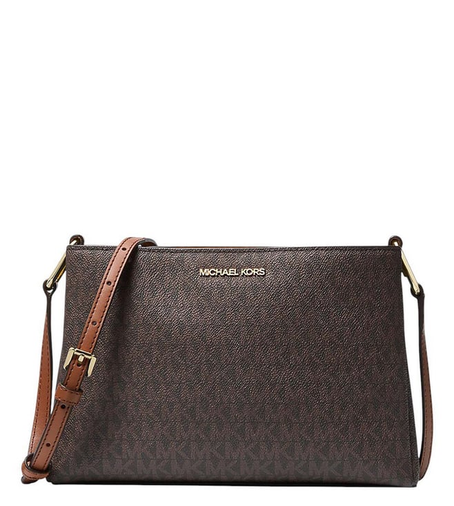 Michael Kors brown trisha medium crossbody bag crafted in coated canvas and polyester featuring zip closure, 3 compartments, inside slip pocket, metal logo, adjustable crossbody strap. Products purchased from Darveys are supported exclusively by the warranty/exchange policies of Darveys and its partner boutiques. Brand owners and their channel partners are not responsible for exchange/warranty services for items purchased through Darveys.