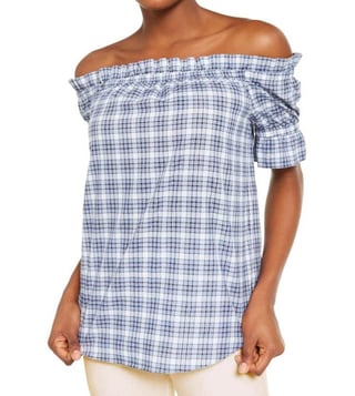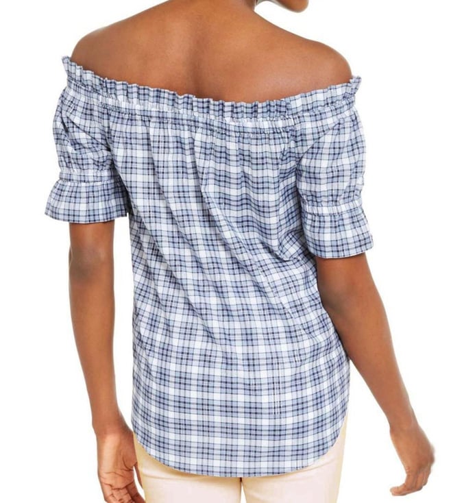 Adorn the modern look with this chambray checked off-shoulder top from Michael Kors crafted in cotton/metallic/elastane featuring off-shoulder, short sleeves, all-over check print, curved hem. Products purchased from Darveys are supported exclusively by the warranty/exchange policies of Darveys and its partner boutiques. Brand owners and their channel partners are not responsible for exchange/warranty services for items purchased through Darveys.