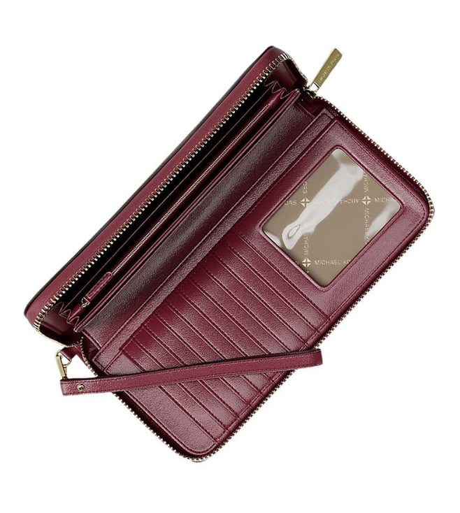 Accessorize perfectly with this cherry jet set zip around wallet by Michael Kors crafted in leather featuring zip closure, id window, card slots, bill compartment, zip coin pocket and logo detailing to give you luxe appeal.