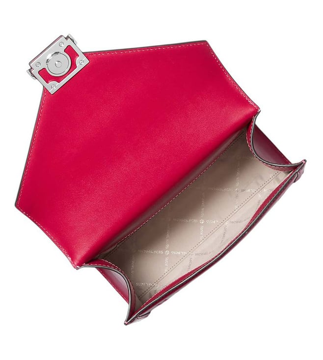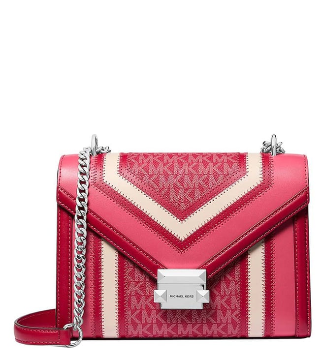 Michael Kors dark pink whitney colorblock medium shoulder bag crafted in polyurethane and cotton featuring snap closure, 1 compartment, inside slip pocket, metal logo, convertible chain-link shoulder strap. Products purchased from Darveys are supported exclusively by the warranty/exchange policies of Darveys and its partner boutiques. Brand owners and their channel partners are not responsible for exchange/warranty services for items purchased through Darveys.