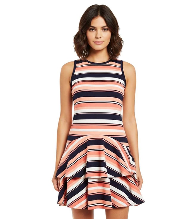 Coral Peach Multi Crewneck Striped Flare Dress